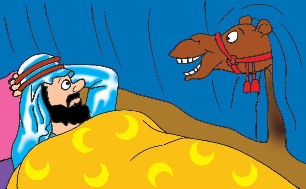 The kind man felt sorry for the camel. “Oh my poor camel. It is very cold outside,” he thought. So he let the camel put its head inside the tent. Then he went back to sleep. But after a while, the camel he awoke his master again.