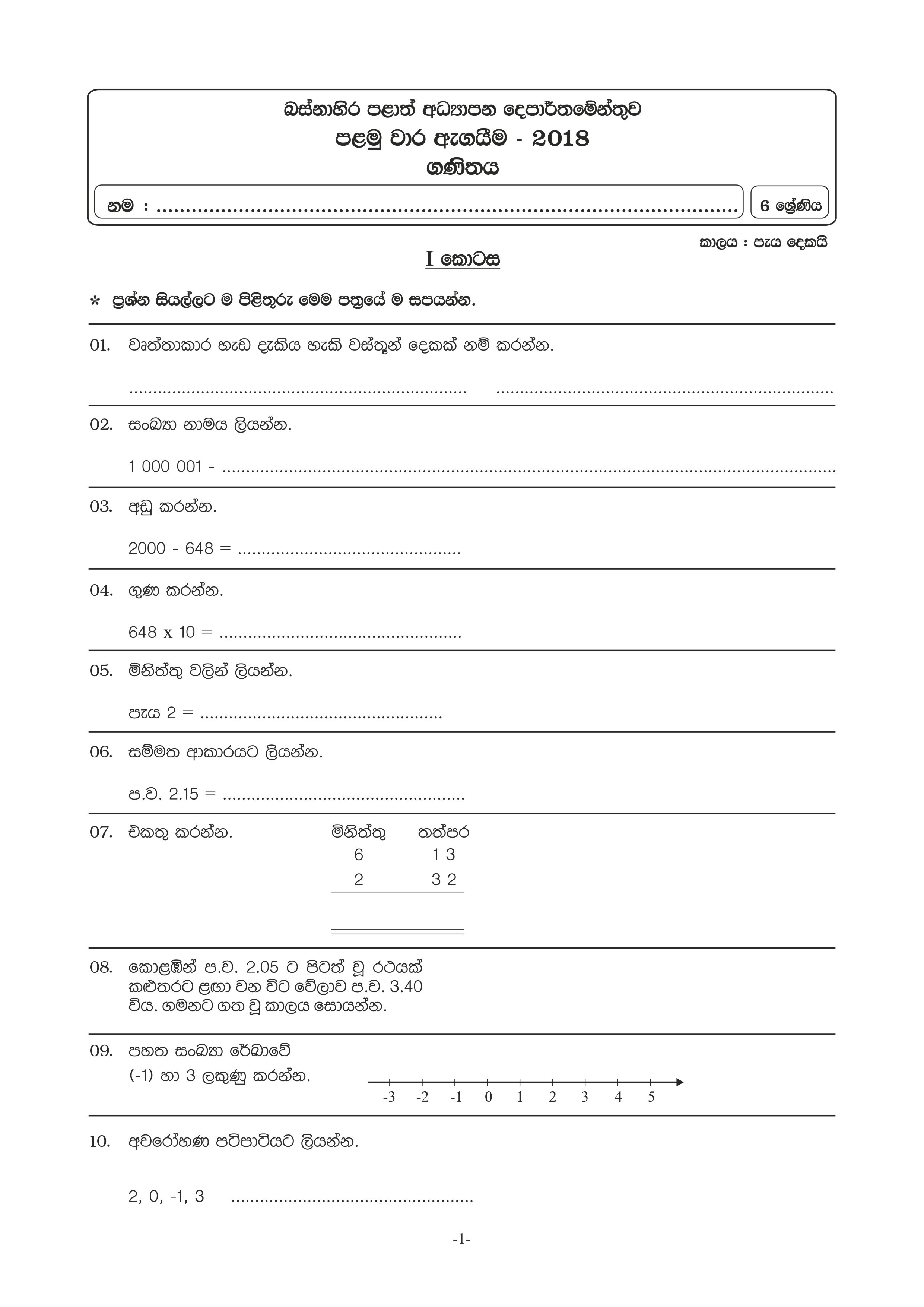 බස්නාහිර පළාත පළමු වාරය I,II ප්රශ්න පත්රය 2018 -page 1